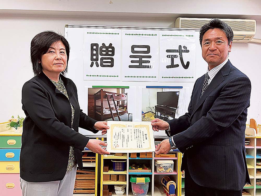 【岡山】三菱電機中国支社(中村真久支社長)は、社員からの寄付に会社が同額を上乗せするマッチングギフト制度「三菱電機SOCIO-ROOTS(ソシオルーツ)基金を活用し、広島県と岡山県の7施設に約117万円を寄贈した。4月下旬には岡山市の岡山聖園子供の家、岡山県津山市の立正青葉学園と2カ所で贈呈式を行った。
