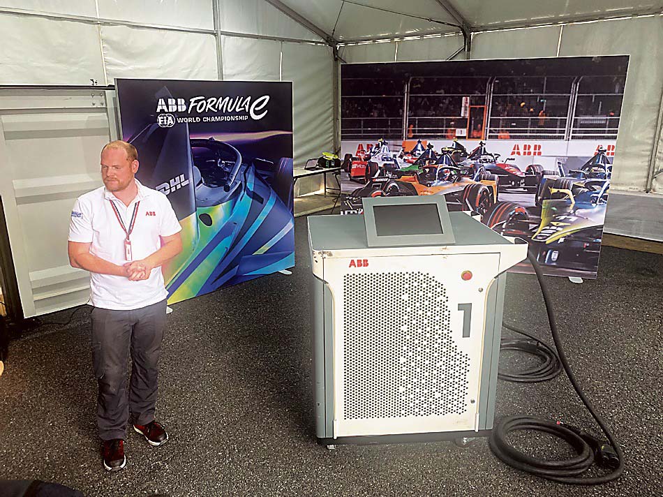 2025.05.23 ABBがカーレース会場で急速充電器紹介 協働ロボと組み合わせEVへの給電デモも