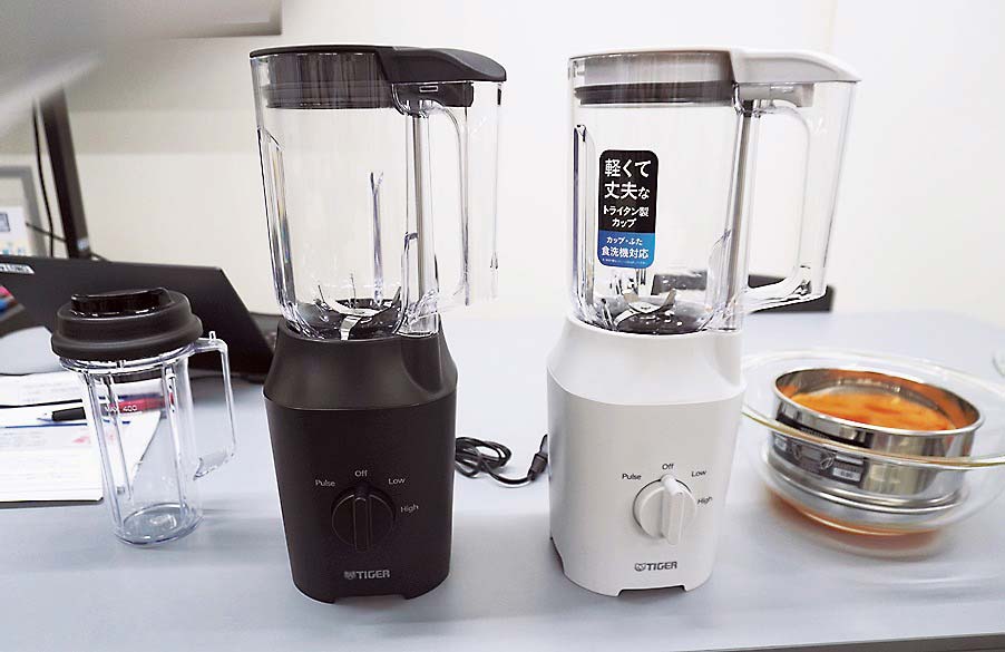 タイガー魔法瓶は、冷凍フルーツなども粉砕できる高い切削能力を持ち、少量の調理にも対応した縦型ミキサー2機種を発売する。