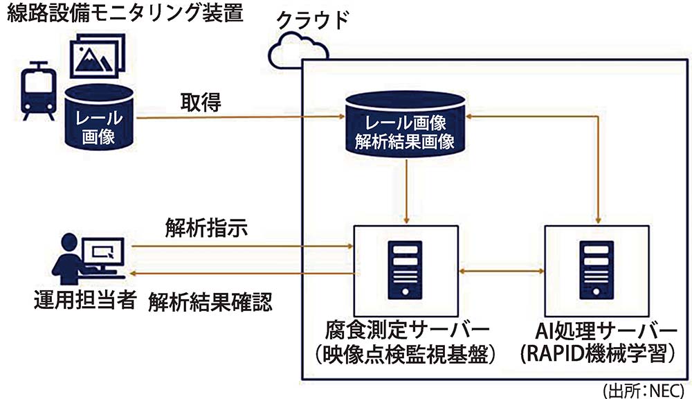 NECと東京メトロは、人工知能(AI)と画像解析技術を活用したレール腐食検知システムを共同開発し、東京メトロ千代田線で本格運用を始めた。営業列車に搭載された線路設備モニタリング装置で撮影したレール画像をAI解析する仕組みで、今後は他路線にも展開する予定。