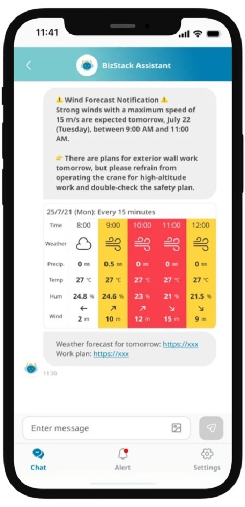 新機能の天候情報連携では、1時間ごとの天気予報(最大72時間先)や10日先までの日別予報のほか、気象庁の警報・注意報などを取得し、対象現場の位置情報と自動でひも付けて表示できる。ユーザーが「あの現場の天気は」などと問いかけると、AIアシスタントが即座に回答する仕組みである。将来的には、工程表との照合により作業種別に応じた気象アラートを配信することも想定されている。