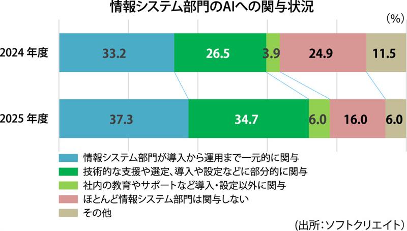 ソフトクリエイトは、情報システム部門を対象に実施した「AI導入・活用における企業の動向と情報システム部の意識調査2025」を公表した。AI(人工知能)導入や運用に関与する情シスの割合は前年の約6割から8割弱に増加し、全社的な活用が進む一方で、組織的に取り組む企業は5%未満にとどまった。