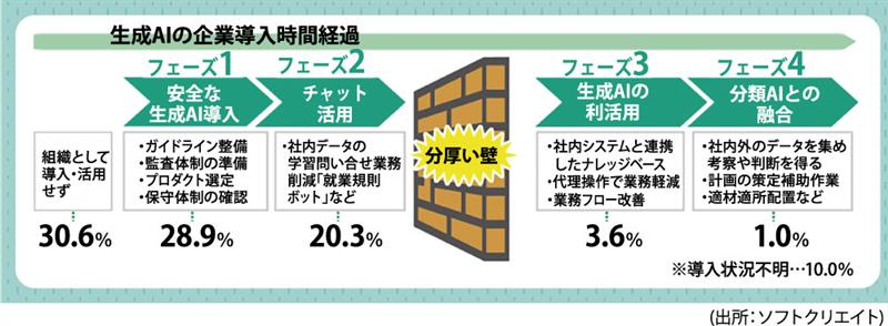 導入の主流は「安全な生成AIの導入」(28.9%)や「AIチャットの業務利用」(20.3%)に集中し、「社内システムとの連携」は3.6%と低水準にとどまる。AI活用が業務単位で分散し、全社最適化が進みにくい状況が浮き彫りとなった。