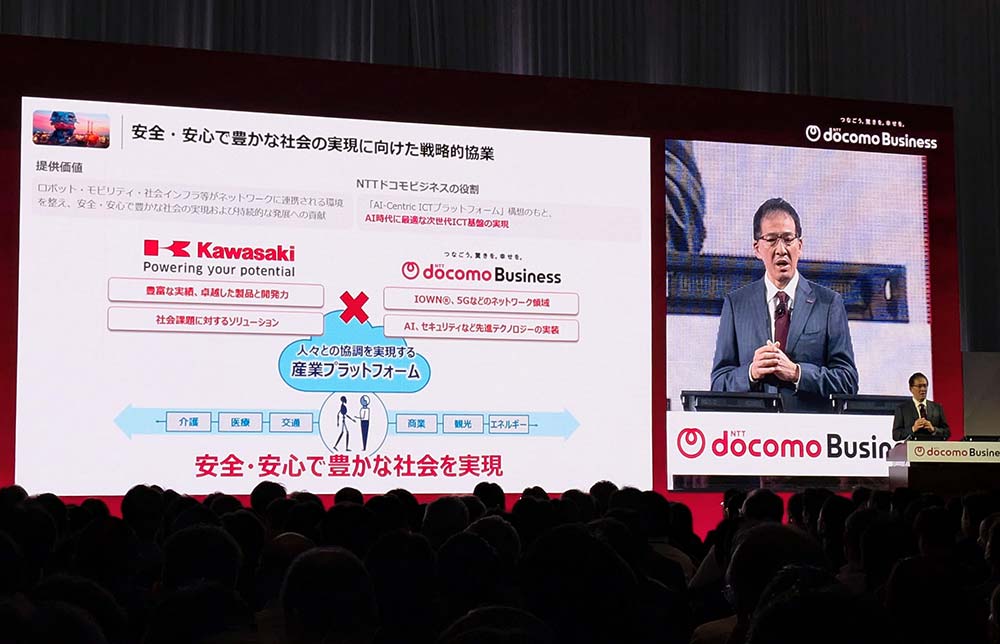 両社は9日、戦略的協業に関する覚書を締結したと発表した。同日に東京都内で開いたNTTドコモグループの法人顧客向けイベント「NTT docomo Business Forum'25」の基調講演で、NTTドコモビジネスの小島克重社長が今回の協業に触れ、「さまざまなロボットがネットワークで産業プラットフォームに接続される環境を整え、人とロボットが共生する安全・安心で豊かな社会の実現に向けて取り組む」と表明。報道関係者の取材にも応じ、ロボットの管理・運用を支えるプラットフォームの構築に意欲を示した。