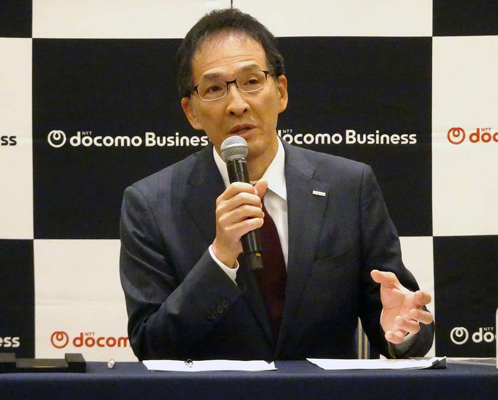 報道関係者の取材に応じるNTTドコモビジネスの小島克重社長=東京都港区
