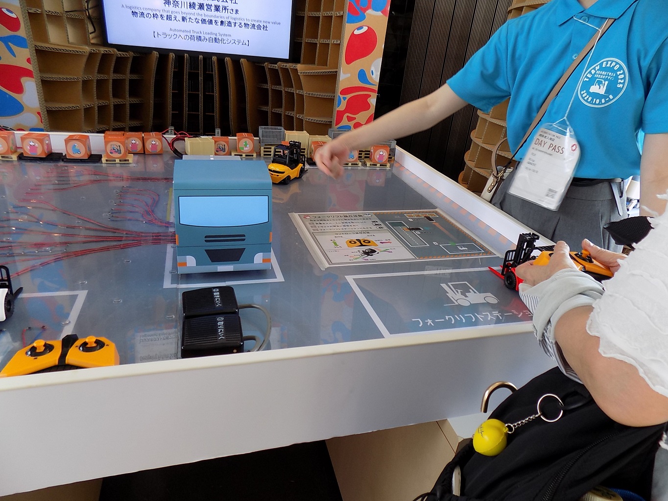 出展場所は、万博会場内のフューチャーライフゾーン。ブースでは、フォークリフトのラジコンを使用した荷役体験や「未来のあるべき姿」のパネルを掲示。同社のキャラクター「ロジスポン」「ネクスコン」のスタンプがもらえるコーナーも用意。長蛇の列ができるほどの人気ぶりだった。