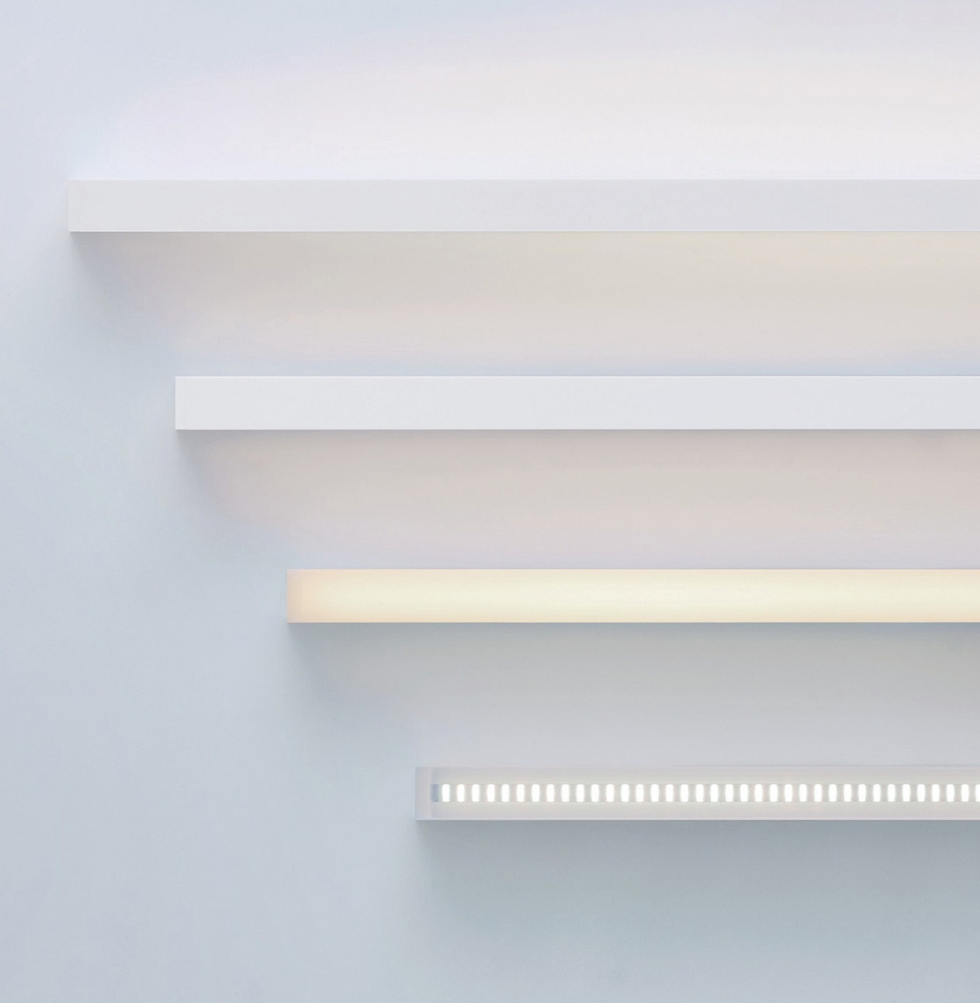 また、片面配光タイプ、両面配光タイプは造作と組み合わせず、単体で壁や天井に間接照明として設置することも想定したデザインを採用し、より手軽に間接照明を導入できる。