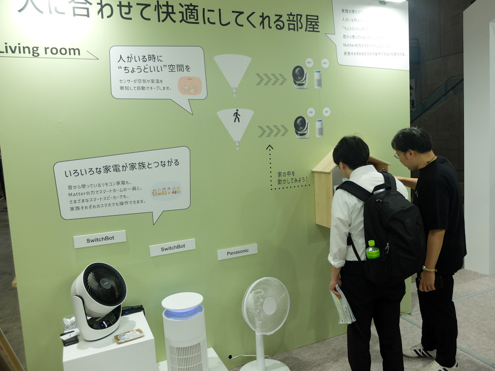 デモには7社のIoT家電やIoT機器を利用。例えば、リビングルームのシーンでは、人感センサーで人の在室を検知するとMatter対応のサーキュレーターや空気清浄機が自動的に稼働する。赤外線センサーで動く扇風機も、Matter対応のハブから赤外線で指示が飛び同時に稼働。別メーカーのMatter対応品だけでなく、日本の家庭で一般的な赤外線センサーの家電もまとめて動作できるデモを行った。