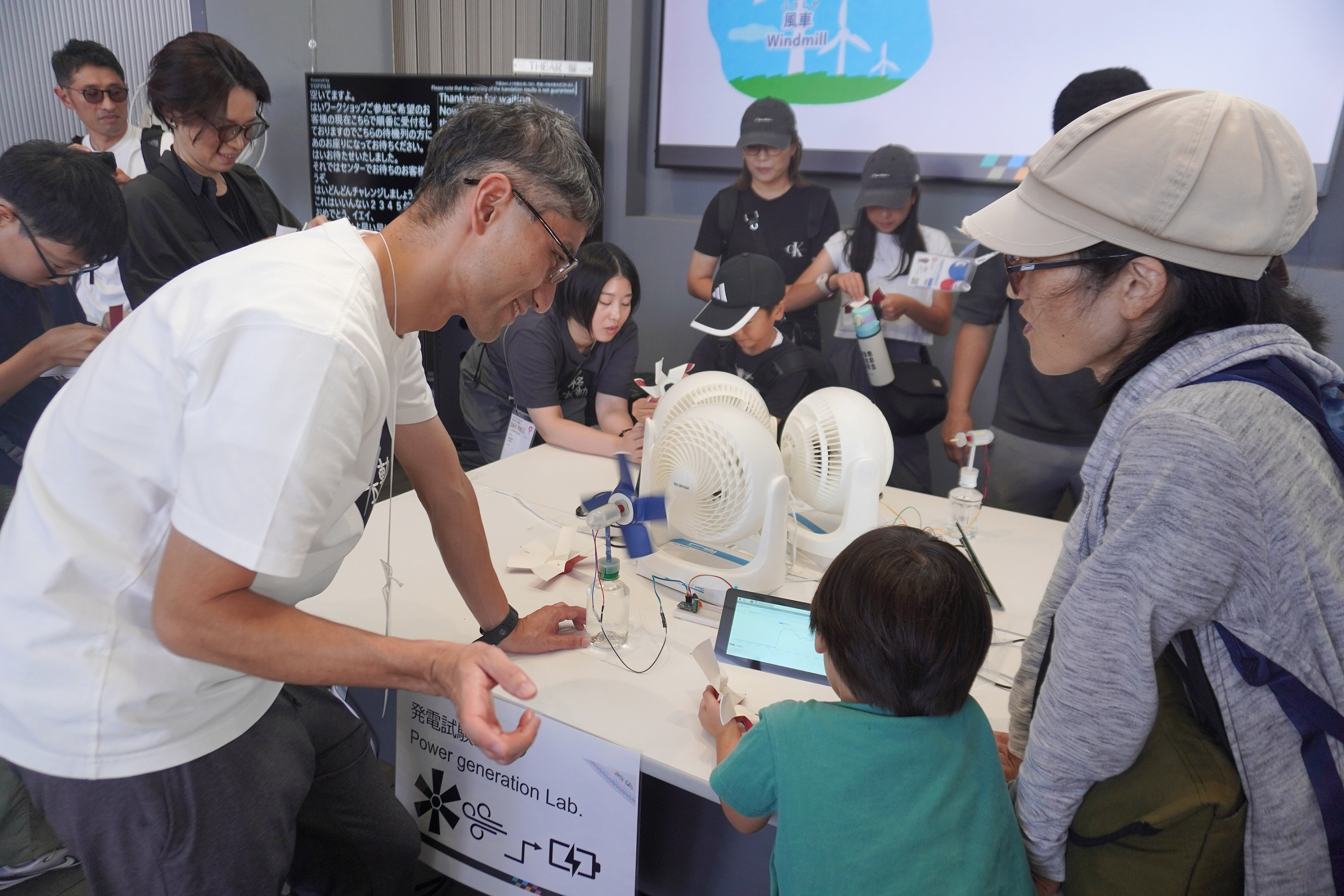 ワークショップでは、紙コップを使った風力発電機の制作を実施した。参加者は、切り込みを入れた紙コップを自由に折り曲げて風車を作成。風車とモーターを組み合わせて発電した電気を動力源に、「モビリティー」や航空自衛隊のアクロバット飛行チーム「ブルーインパルス」の模型を動かす体験の機会を得た。モビリティーは、未来の都市で展示している4脚モビリティーを模したものとなっている。