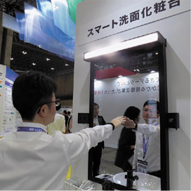 コーデンシは、デジタルイノベーションの総合展示会「CEATEC2025」に、未来のスマート洗面台、スマートキッチンを出展。洗面台は非接触操作用センサーやミラーディスプレー、カメラを搭載。鏡に触れることなく、ディスプレーに表示される情報の切り替えなどを操作できる。鏡の両サイドにあるカメラは個人を認証するほか、三面鏡の役割も果たす。会場では体験しようと待ち列ができていた。