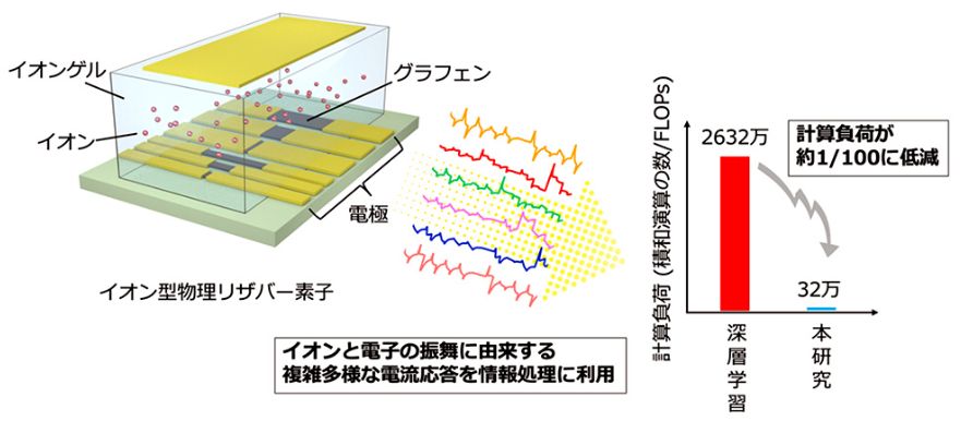 今回、NIMS、東京理科大、神戸大の研究チームは、イオンを利用する物理リザバー素子を開発し、深層学習並みの高い計算性能と桁違いに低い計算負荷を実現した。高い電子移動度や両極性を持つグラフェンと、イオンゲルを組み合わせることで、速度が異なるさまざまな反応(イオンと電子がさまざまな形で動く)が複雑に関係しながら進むため、非常に広い範囲で時定数(変化速度)が異なる入力信号に対応が可能となる。その計算性能は、従来型物理リザバーの中でも最も高い計算性能を示し、ソフトウエアで実行した深層学習と同等の計算性能ながら、計算負荷を約100分の1まで低減することに成功した。
