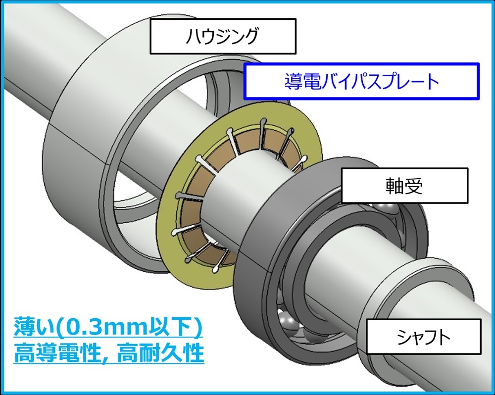 モーター、インバーター、減速機を一体化した駆動ユニット「eAxle」などの電動車の駆動部が求める高度なニーズに対応。不具合の原因となる電食への対応や、電子機器から発生する電磁ノイズを抑制するEMC(電磁両立性)の対策に貢献する。