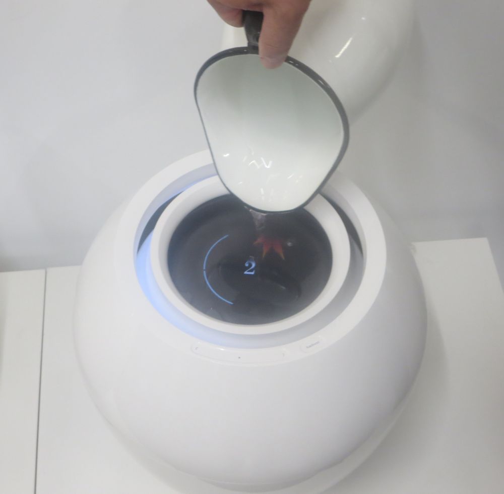 新製品は、高精細LCDディスプレーを採用し、室温や湿度、タンク容量などの情報を表示する。モードや風量の設定もボタンのスワイプやタップで簡単に行える。水を注いだ際には、泳ぐ金魚や水面に浮かぶもみじの2種類をディスプレーに表示することで、落ち着いた印象を与える。