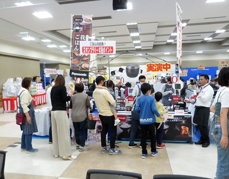 会場では、補聴器カーがかけつけていたほか、システムキッチンやバス、トイレなどのリフォーム商材も展示。中央には、炊飯器を使った新米、古米の炊き分けや、赤飯などの実演のほか、電子レンジによる調理や試食も行われた。