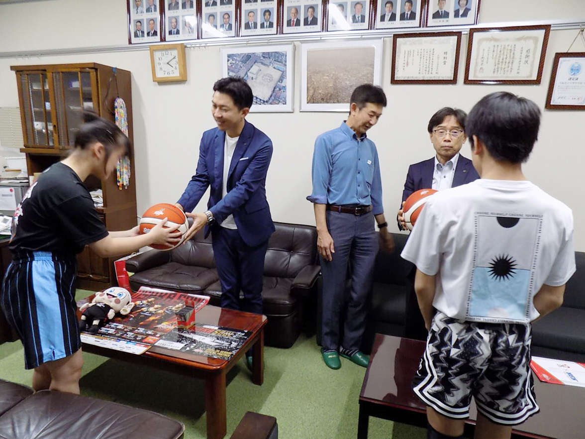 寄贈先は小学校12校、中学校5校で、バスケットボール5号球 24球、6号球(12面体) 10球、7号球(同) 10球。バスケットボールは両者のロゴ入りの特別仕様。