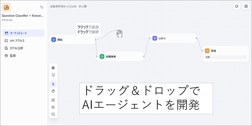 Dify Enterpriseは、米LangGeniusが提供するAIエージェント開発基盤。専門的なプログラミング知識を必要とせず、ドラッグ&ドロップなどの操作で自社データ・業務特化型のAIエージェントを構築可能にするノーコード開発基盤。複数人による共同編集機能やアクセス管理のほか、シングルサインオン対応、運用支援サービスも備える。3年後に30億円の売り上げを目指す。