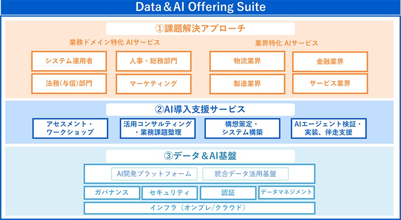 Data&AI Offering Suiteは、KPI(重要業績指標)達成の阻害要因を特定し、手作業依存や属人的な業務をAIエージェントによって再設計・効率化するサービス群。診断から業務設計、運用までを一体で支援し、オンプレミス(社内運用)、クラウドを問わずデータ基盤を構築する。3年間で100件の受注を目指す。