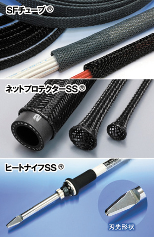 ネットプロテクターSSは、自動車や自動二輪車の各種ホース、パイプを摩擦から保護する耐摩耗性を持つ。指定の長さに加工して納入するカット仕上げ品は、独自の溶着技術で処理された挿入部分(世界主要各国にて知財権取得済み)が装着時のほつれを防ぎ、スピード装着を可能とした。装着後は端部のほつれ止めを目的としたテープ巻きなどが不要となることからコストダウンに貢献する。