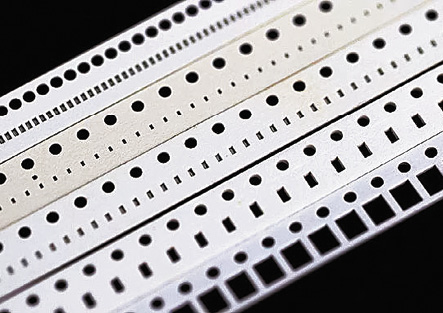 8mm幅キャリアテープは、紙テープのパンチ品、プレス品、フィルムテープのパンチ品、エンボス品を供給する。紙テープは0402~3817サイズのチップ部品に対応。トラバース巻で1600~4800mの長尺巻が可能で、テーピング工程での生産性、低コスト化を推進できる。