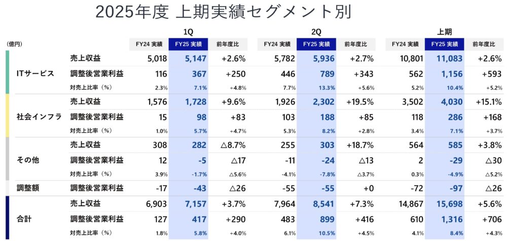 主力のITサービス事業は、国内のパブリック分野が引き続き好調で、法人向けの「BluStellar(ブルーステラ)」がけん引した。上期の売上高は前年同期比2.6%増の1兆1083億円、調整後営業利益は同593億円増の1156億円となった。ブルーステラ単体の売上高は19.8%増の2880億円、営業利益は261億円増の396億円に拡大し、収益性が大幅に改善した。