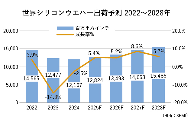 半導体の国際団体SEMIは、シリコンウエハーの世界出荷面積が、前年比5.4%増の128億2400万平方インチになるとの予測を発表した。昨年は前年比減だったが、昨年下半期から回復に転じていた。今年からは安定成長を維持し、2028年には過去最高を更新する見込みという。