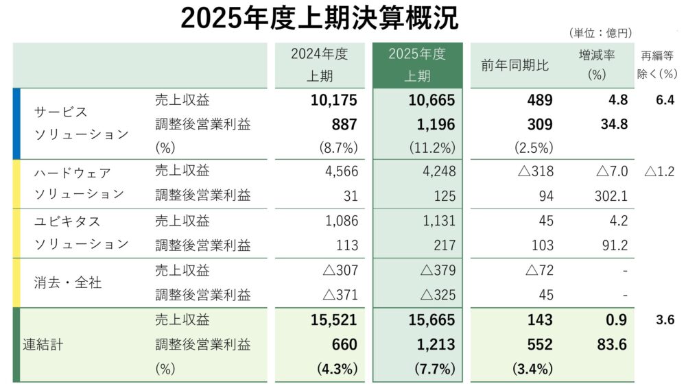 富士通が30日に発表した2026年3月期第2四半期(25年4~9月)連結決算は、売上高が前年同期比0.9%増の1兆5665億円、調整後営業利益が同83.6%増の1213億円となった。営業利益・純利益ともに過去最高を更新した。主力のサービスソリューション事業が堅調で、採算性改善が利益拡大をけん引した。