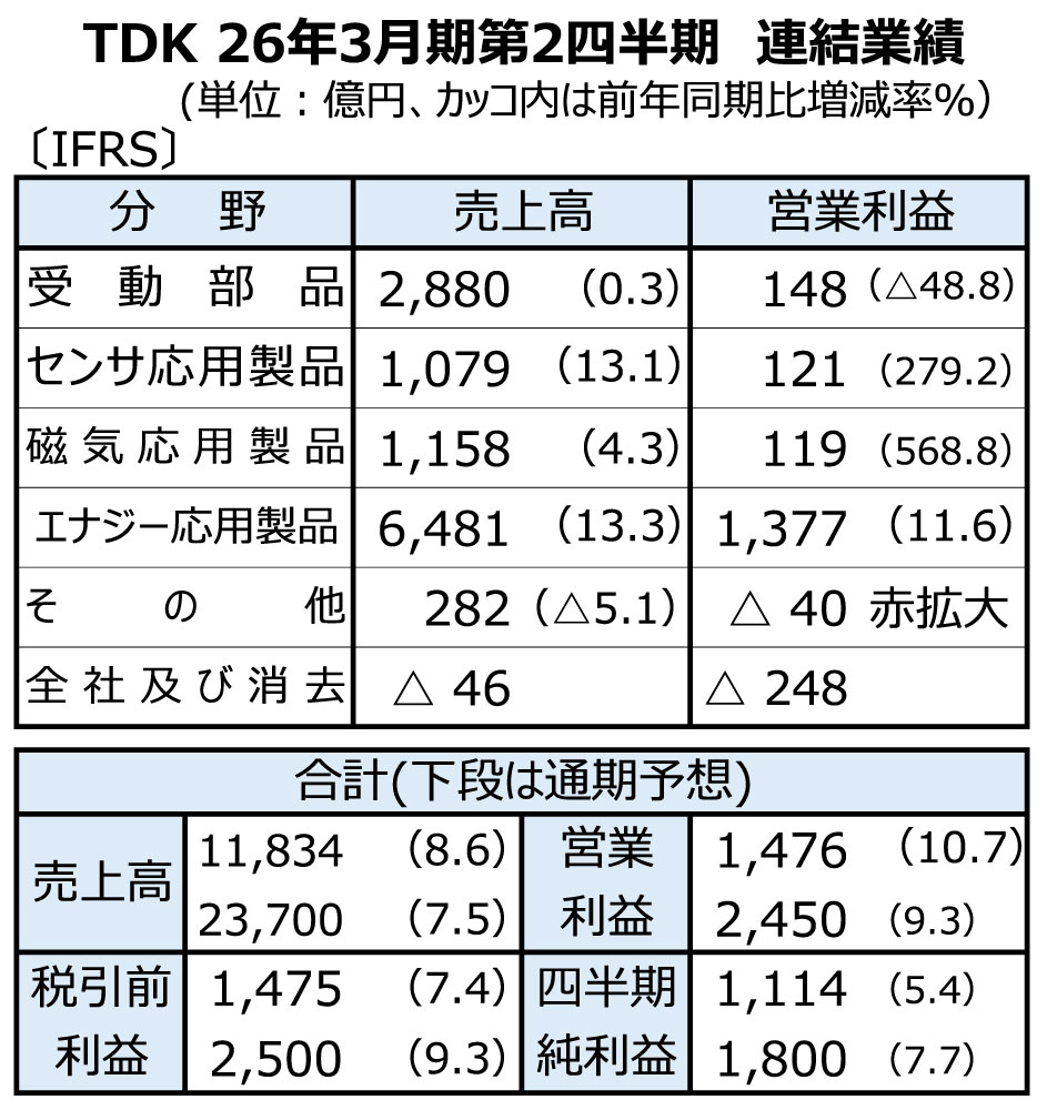 TDKの2026年3月期第2四半期(25年4-9月)連結決算(IFRS)は、増収増益となり、売上高と全ての利益項目で上期としての過去最高を更新した。ICT(情報通信技術)市場やHDD市場の堅調さが業績を押し上げた。今年度通期の売上・利益予想も上方修正した。