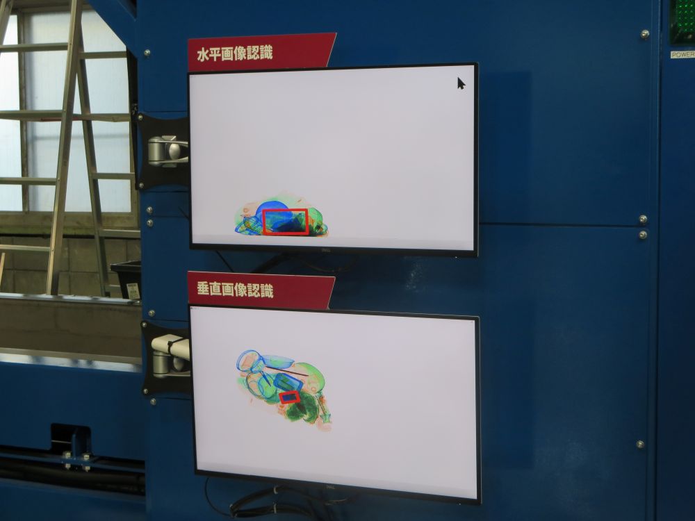 異なるエネルギーレベルのX線を同時に照射するデュアルエナジーX線で材質の特長情報を含んだX線画像を撮影する。その後、独自の認識アルゴリズムを用いたAIエンジンで対象物を正確に特定。除去対象物の位置を特定し、プロジェクターで作業者への位置通知が可能となった。X線画像は垂直と水平の2方向から撮影するため、ごみが混在する中から対象物を認識する。