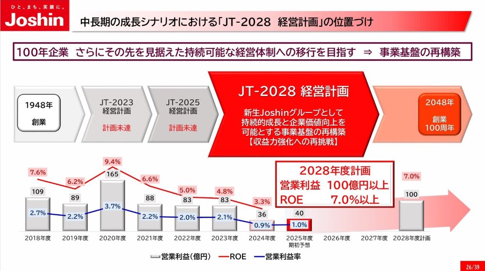 上新電機は4日、2026年度~28年度の新中期経営計画「JT-2028経営計画」を発表した。家電量販店の強みである豊富な品ぞろえに加え、きめ細かなサービスの提供で「家電量販店版マチの電器屋」を目指す。オンライン対応を含めた顧客の困り事解決やプライベートブランド(PB)商品の開発に取り組み、28年度に営業利益100億円以上、ROE(自己資本比率)7.0%以上を目指す。
