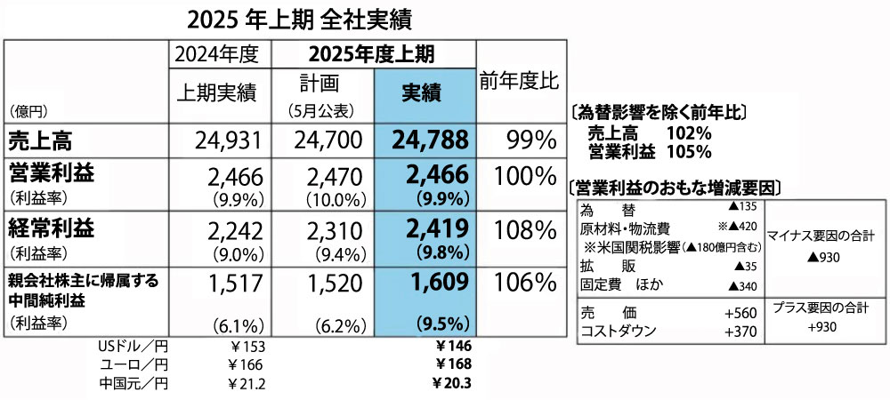 為替を除く実質ベースでは、売上高、営業利益ともに増収増益となった。売上高が前年同期比99%の2兆4788億円、営業利益が同100%の2466億円、経常利益が同108%の2419億円、中間純利益が同106%の1609億円だった。