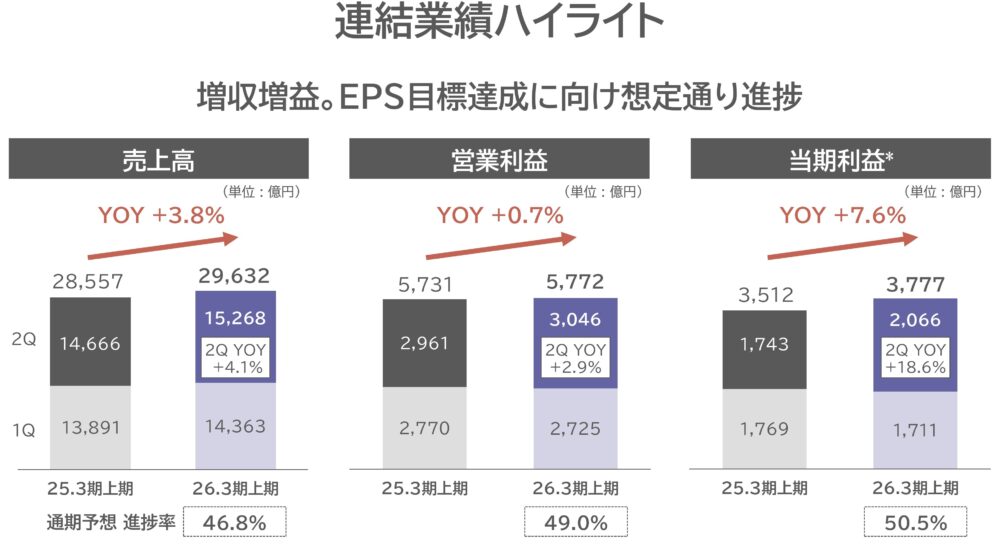 KDDIが6日発表した2026年3月期第2四半期(25年4~9月)連結決算は、売上高が前年同期比3.8%増の2兆9632億円、営業利益は同0.7%増の5772億円、純利益は同7.6%増の3777億円となり、増収増益を確保した。EPS(1株当たり利益)目標達成に向け順調に進ちょくしている。