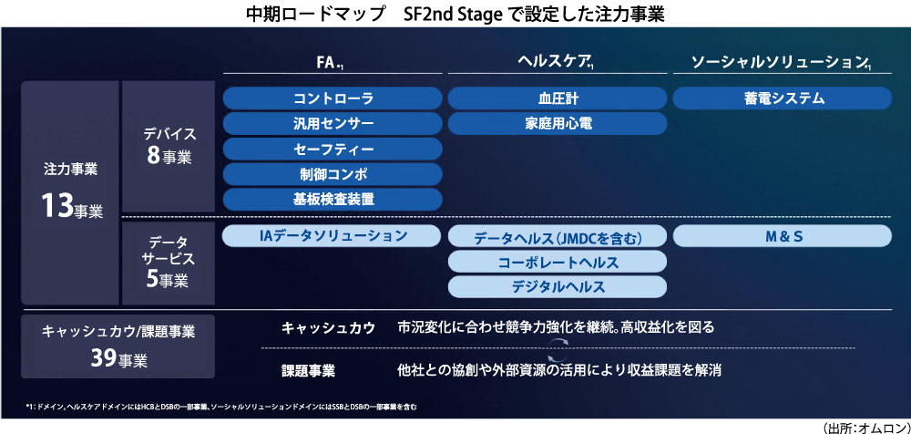 コア戦略として事業ポートフォリオの再構築を掲げ、13の注力事業を特定。コントローラーや血圧計、蓄電システムなどのデバイス8事業とデータサービス5事業で構成される。注力事業に集中して投資することで生まれたキャッシュもデータサービス事業に展開することで、持続的な成長を実現する。