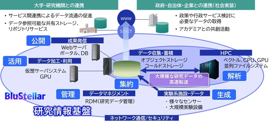 収集・蓄積された研究データを人工知能(AI)も活用して利活用を促す「データカタログ・ポータルシステム」や、リモート計算リソースを高度に活用する「ExpEtherを用いたリモートリソース活用システム」も併せて提供する。