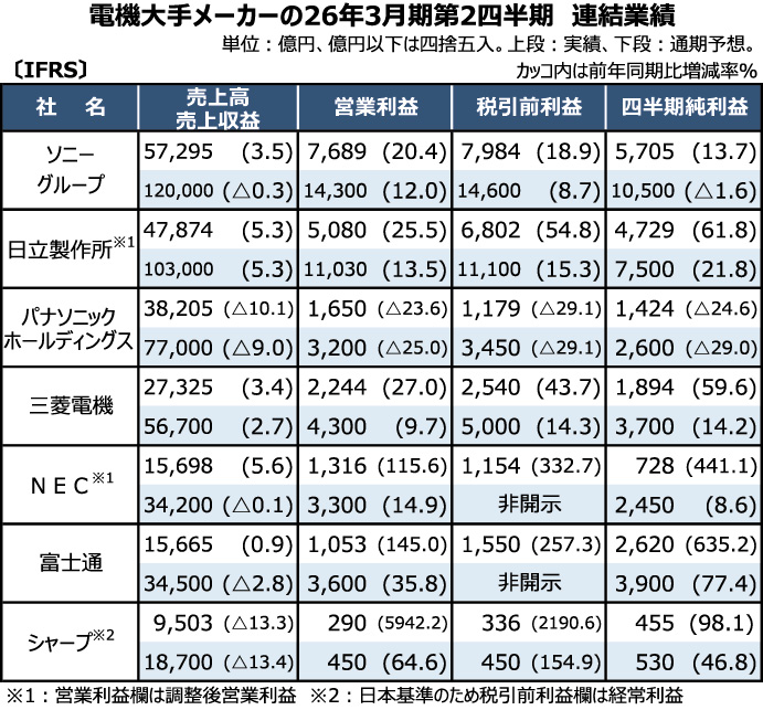 電機・IT関連主要各社の2026年3月期第2四半期(25年4~9月)連結決算が出そろった。総合電機大手はパナソニックホールディングス(HD)を除く7社が、デジタルトランスフォーメーション(DX)需要の拡大や米トランプ政権による関税政策の影響緩和などをプラス要因に前年同期比で営業利益が伸長。事務機大手の営業増益も目立った。大手家電量販店もパソコン(PC)や携帯電話の買い替え需要増を追い風に全社が増収を達成。個人向けを含む両業界は下期も勢いを維持する... (つづく)