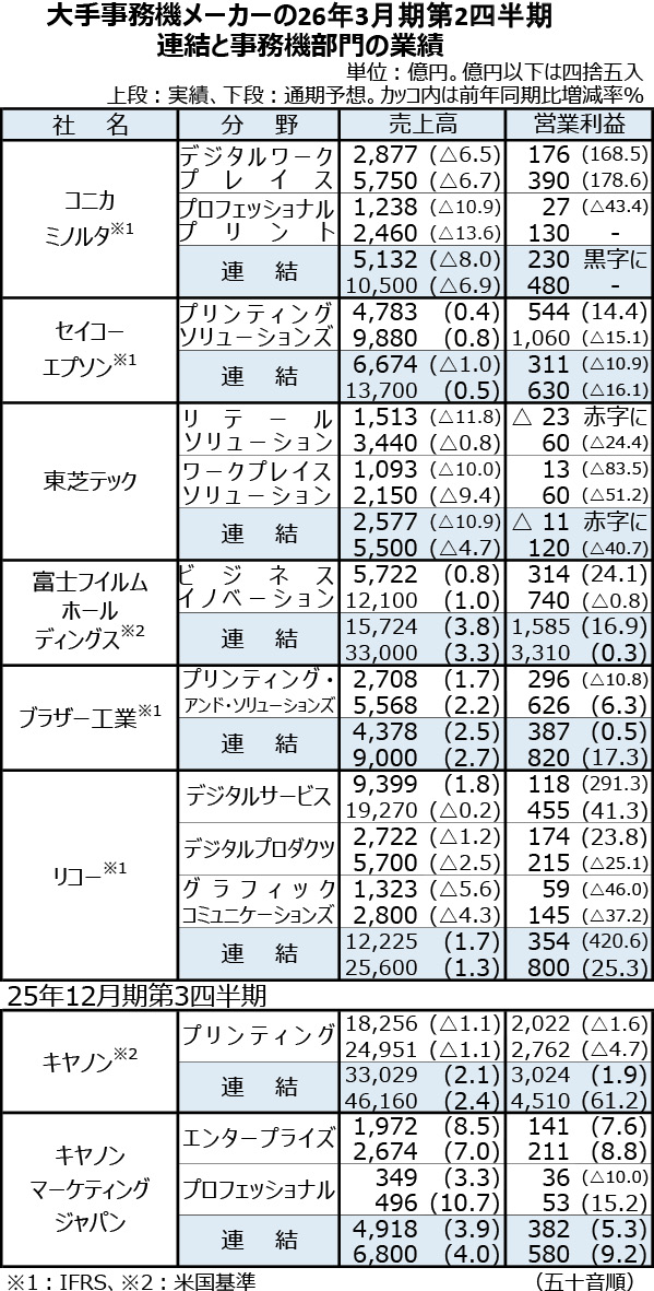事務機分野を主力事業とするリコーや富士フイルムホールディングスなど各社の2026年3月期第2四半期(4~9月)業績が出そろった。欧州景気の低迷や米国の関税政策といった逆風が続く中、事業構造改革の進展や円安傾向が収益を下支えし、営業利益を伸ばす企業が目立った。米国の関税政策緩和や為替の円安進行を踏まえ、通期業績見通しを上方修正する動きも広がっている。