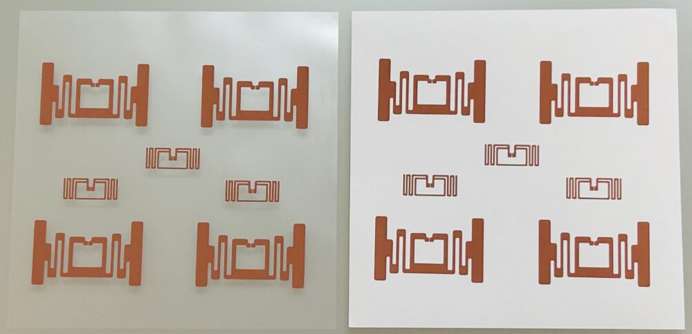 透明フィルムへ印刷したRFIDアンテナ(左)と紙へ印刷したRFIDアンテナ(右)