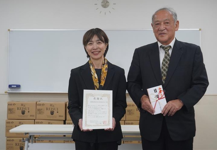 今回は、500mlの備蓄用水1848本を贈った。クレオ大阪中央(大阪市天王寺区)で行われた災害備蓄品贈呈式では、同社管理部の今井晶子担当から同財団の京極務理事長に目録が手渡された。備蓄用水は、講座を修了した約80人の女性ファシリテーターを通じて、防災関連のイベントで配布する。