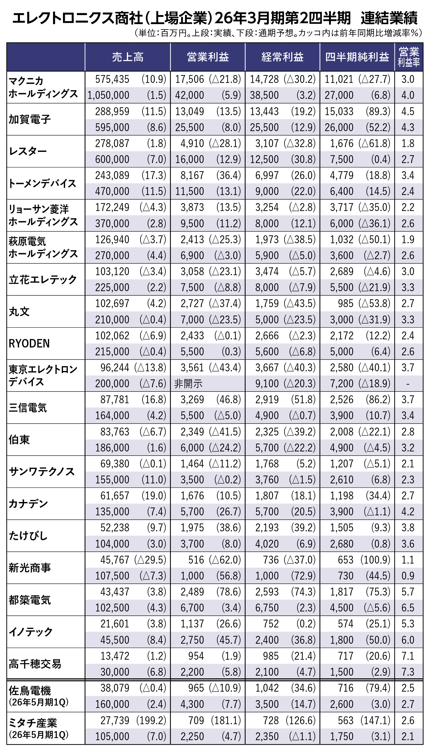 最大手マクニカホールディングスは、集積回路及び電子デバイスその他事業(半導体事業)の売上高が前年同期比11.1%増となった一方、営業利益は同40.3%減となった。AI関連製... (つづく)