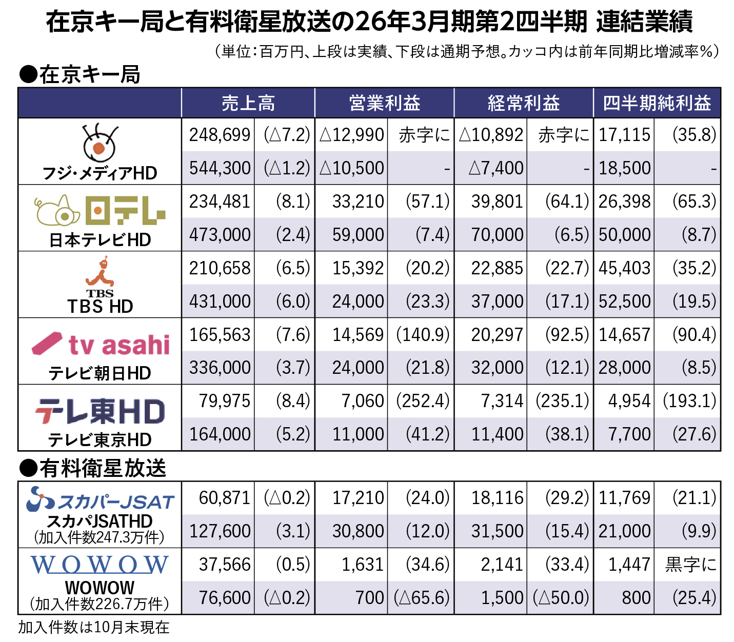 2025.11.24 【業界別決算 大解剖】民放キー局25年4~9月期、フジは減収赤字 他4社は増収増益