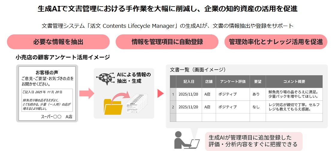 背景には、少子高齢化による人手不足や技能継承の課題がある。法令遵守対応やリモートワーク環境の整備を支えてきた文書管理システムに対して、「保存・検索」から「活用」へとニーズが転換している流れを受け、同社も文書管理のあり方の転換を図っている。