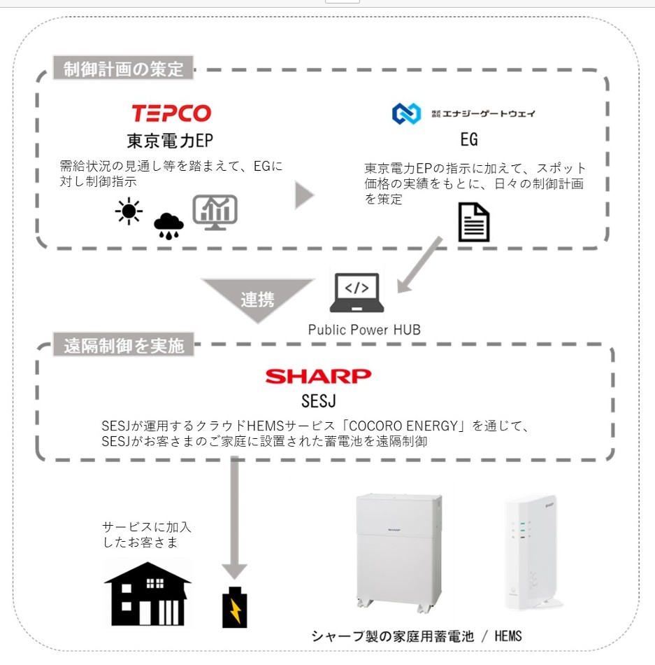 東京電力EPとエナジーゲートウェイ(EG)、シャープエネルギーソリューション(SESJ)の3社は、24年12月~25年3月にかけ、シャープ製の家庭用蓄電池を遠隔制御するDRの実証を実施した。
