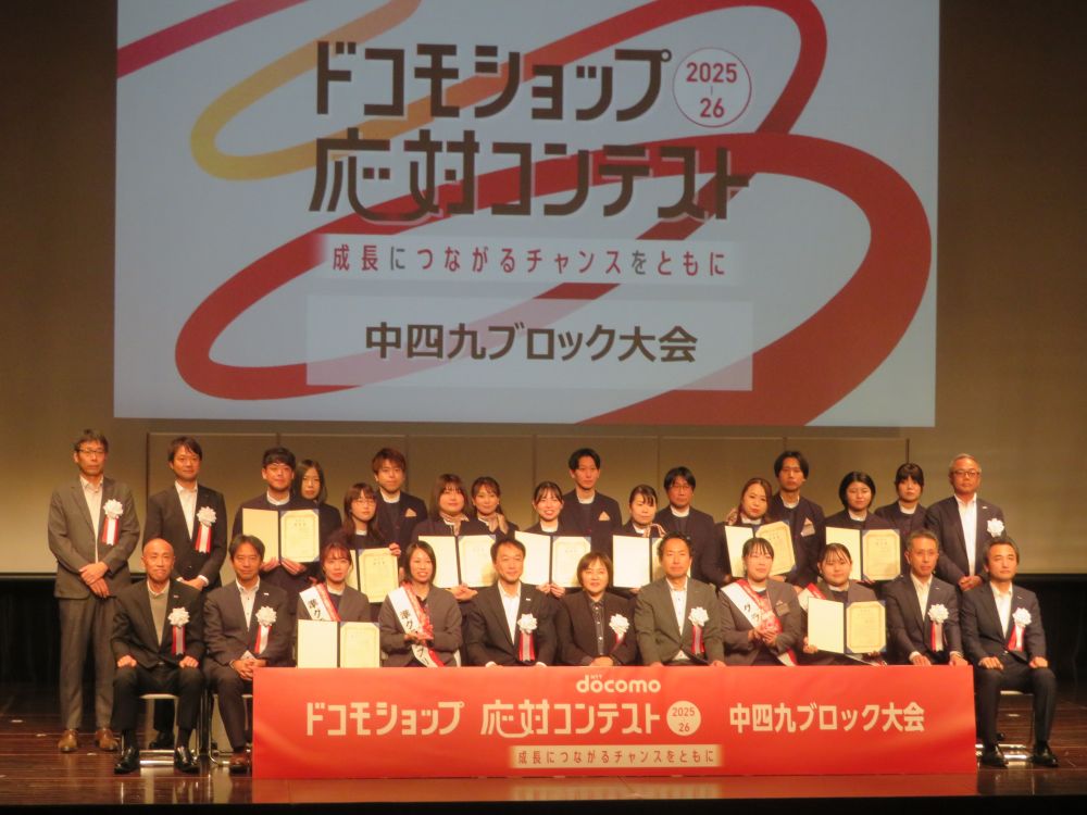 NTTドコモ九州支社は、福岡市中央区の西鉄ホールで「ドコモショップ応対コンテスト 中四九ブロック大会」を開催した。中国・四国・九州の3ブロック合同での開催は初。予選を勝ち抜いた9店が出場し、培ってきた応対スキルを競った。