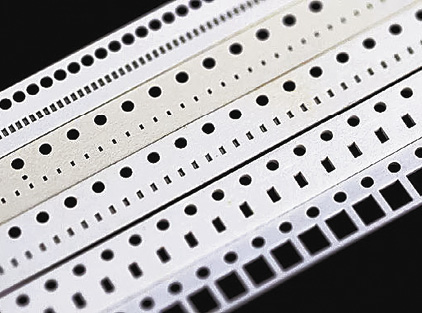 同社のキャリアテープは、高密度実装用から異形チップ、大型SMD、チップLED、さらにはメモリーやパワーデバイスなどパッケージの多様化が進む半導体デバイス用まで、さまざまな種類のSMDをテーピングできる。