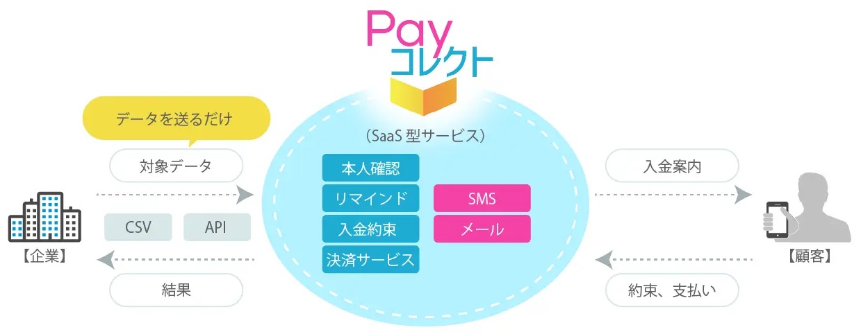 導入企業は入金案内データをアップロードするだけで、SMSやメールによる顧客通知が可能となる。顧客は専用サイトで本人認証後、請求内容確認や入金予定日の登録を行える。決済手段は複数方式に対応し、キャリア共通ショートコード表示やBIMI活用など、不正対策機能も備える。