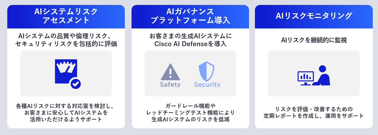 今回の新サービス「NEC AIガバナンスソリューション」は、AIシステムリスクアセスメントとAIガバナンスプラットフォーム導入、AIリスクモニタリングの3メニューで構成する。