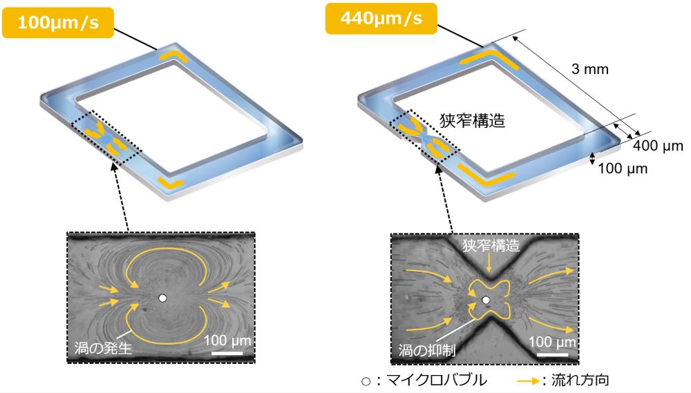 局所加熱で発生させたマイクロバブルの振動とバブル界面の温度差による表面張力の差で生じるマランゴニ力を利用して流れを生成する京大の技術を活用した。一辺3mmの正方形の微細流路内に、従来ポンプと同等の流速100µm/sの流れを起こすことに成功。流路に狭窄構造を設けることでバブル周辺に生成される渦を制限し、流速440µm/sまで向上させることにも成功した。