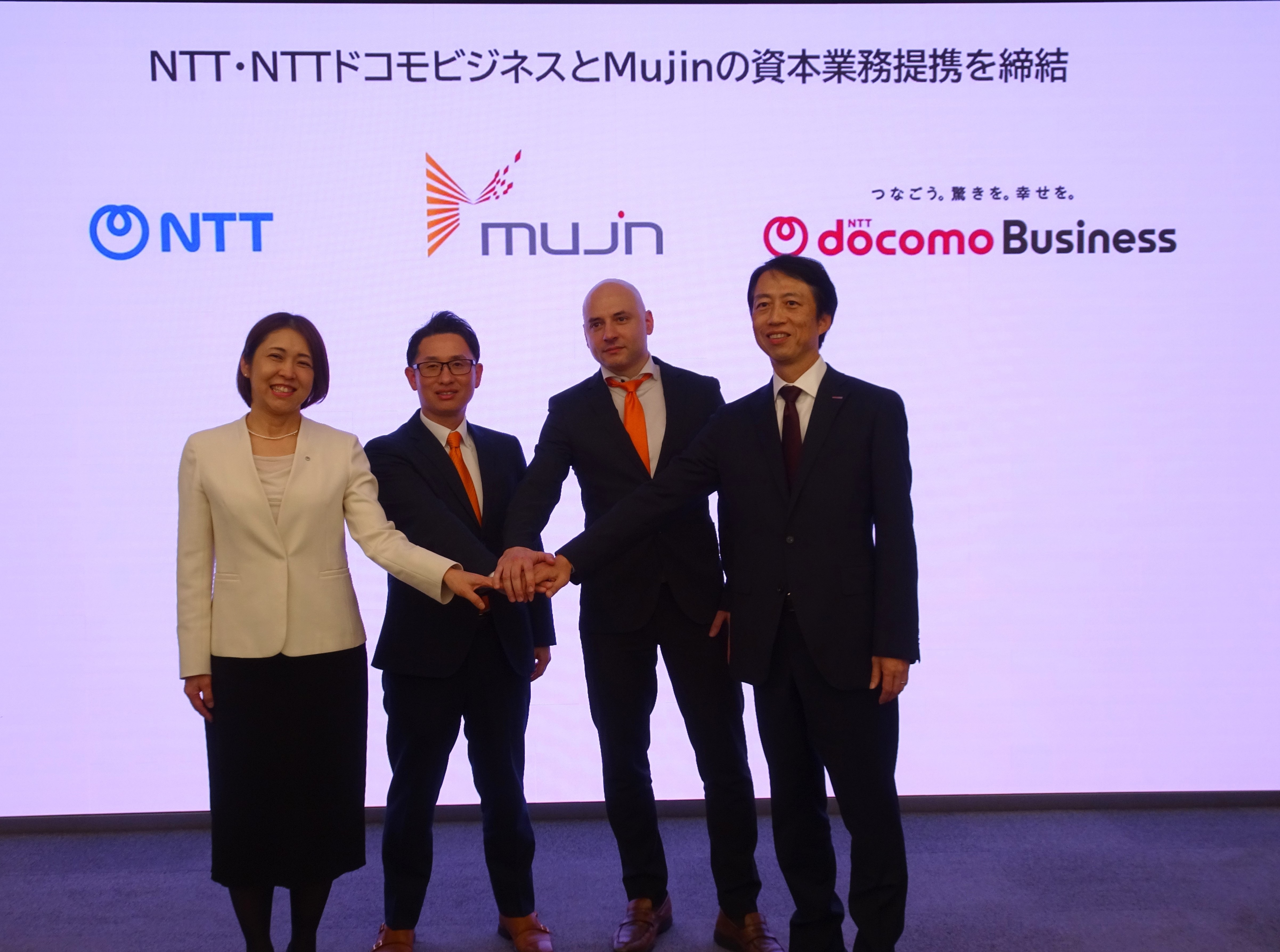 会見に臨んだ(左から)NTTの爪長執行役員、Mujinの滝野CEO、ロセン・デアンコウ最高技術責任者(CTO)、NTTドコモビジネスの山下克典執行役員