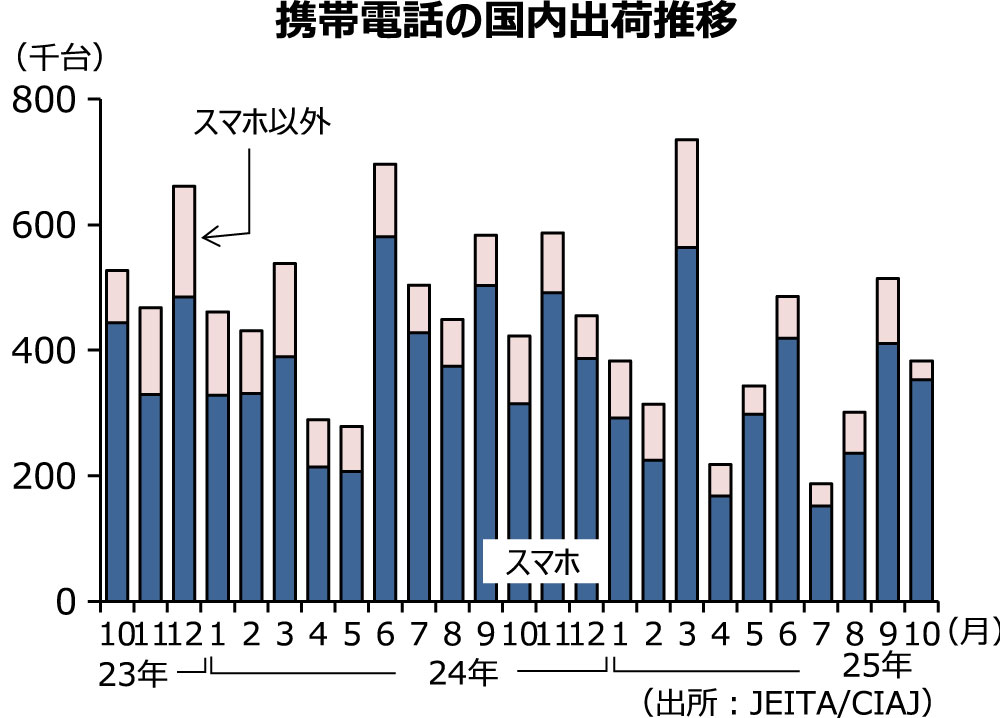 2025.12.09 10月の携帯電話国内出荷台数、前年比9.5%減 JEITA