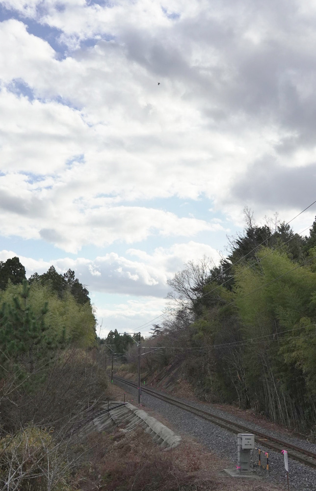 線路をまたぎ飛行するドローン(上空の黒い点)=9日午後、福島県南相馬市(イームズロボティクス提供)