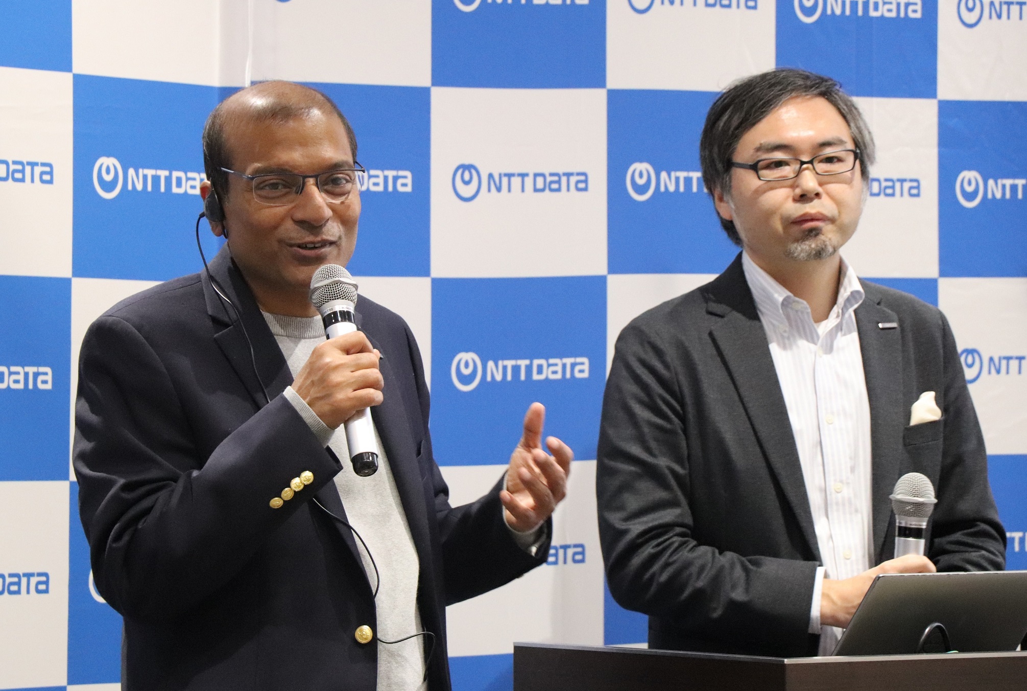 記者会見に臨むNTTデータグループの本橋賢二氏(右)とNTT DATA AIVistaのブラティン・サハCEO